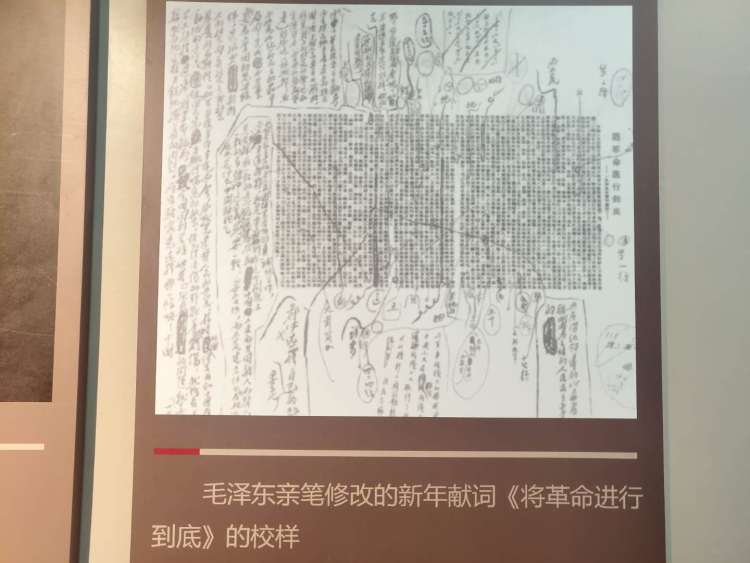 展览现场,展出了毛泽东亲笔修改的新年献词《将革命进行到底》的校样照片。