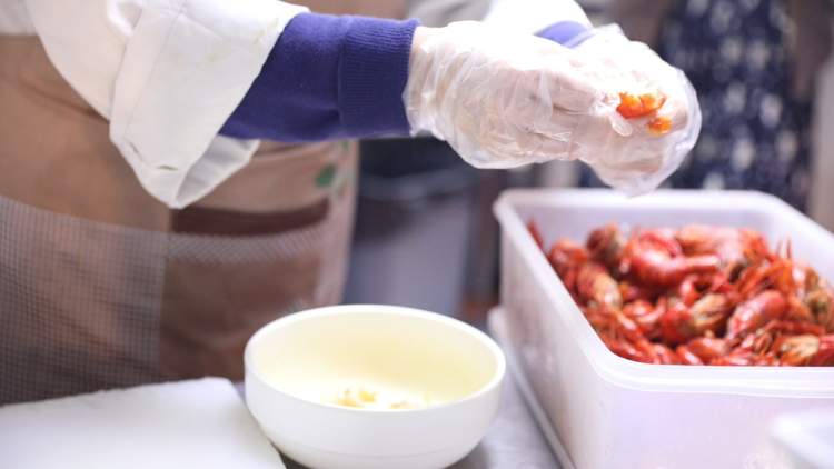 位于田林东路上的实煨家面,后厨的工作人员为你认真地剥小龙虾~