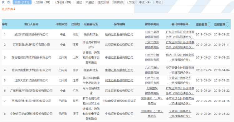其实不止科创板,5月24日证监会公布的发行监管部首次公开发行股票审核工作流程及申请企业情况中,正中珠江负责的项目全部“中止审核”,而上周其中21家还正常排队。