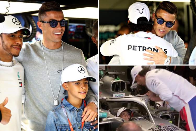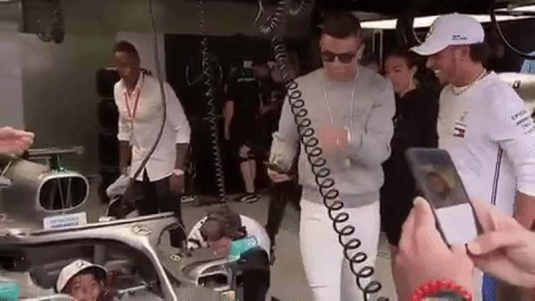 当他结束练习回到车库时,汉密尔顿惊喜地发现有一位特殊的访客正在等待着他——尤文图斯球星,克里斯蒂亚诺·罗纳尔多。