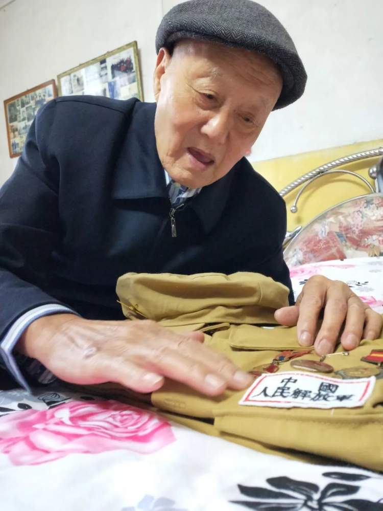 ↑湖北省来凤县人武部为张富清定做了一套老式军装,收到军装后,张富清小心翼翼在整理军装。(朱勇 摄)