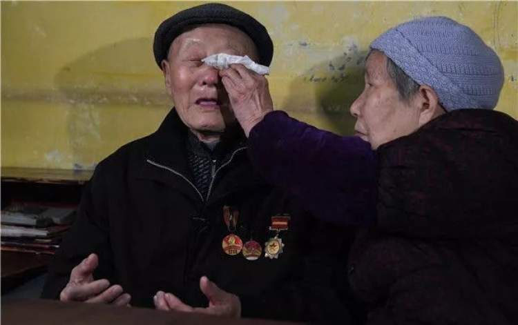 ↑张富清回忆当年并肩作战的战友们牺牲时情景,不禁泪流满面(新华社记者 程敏摄)