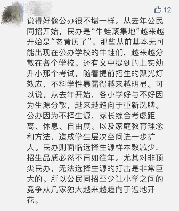 而另一位家长则在一则热门网帖下留言:“从去年开始,各小学因为好与不好生源分散,越来越趋向于重新洗牌,公办因为不择生源,家长综合考虑距离、休息度、自由度、以及家庭教育理念和方法,造成学生层次空间进一步扩大……所以公民同招至少让小学之间的竞争从几家独大越来越趋向于遍地开花。”