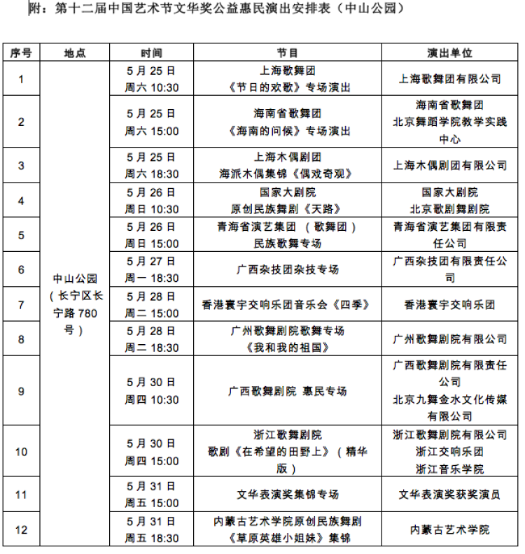 作为本次文华奖惠民演出的唯一户外演出场地,即日起至5月31日,中山公园将上演12台文华奖参评参演精彩演出,内容涵盖歌剧、舞剧、木偶剧、杂技、音乐会等多种形式。