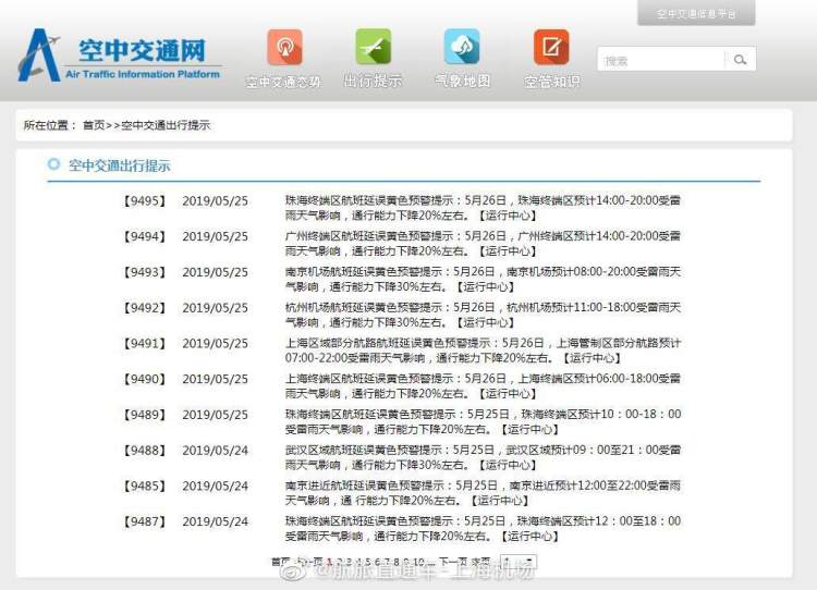 据空中交通网,5月26日,上海终端区预计06:00-18:00受雷雨天气影响,通行能力下降20%左右。详情→http://t.cn/RPPmSMM。