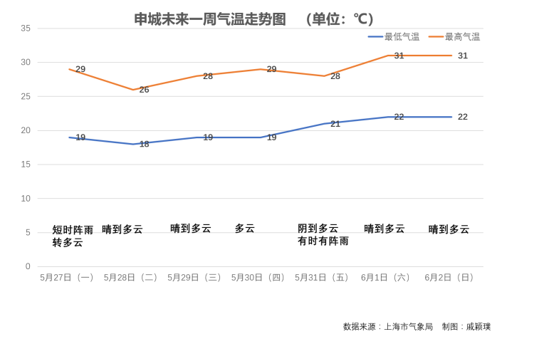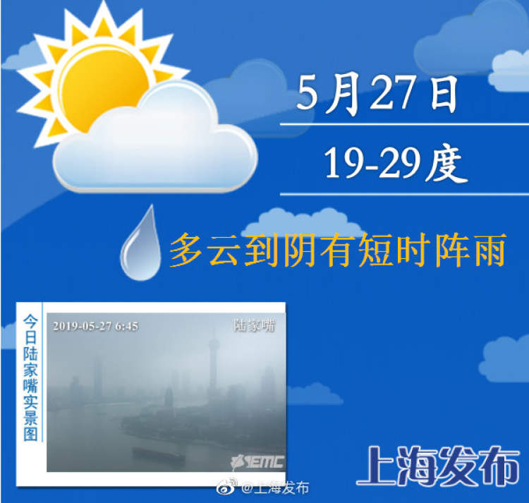 上海本周恢复晴到多云天气。今天的上海延续了昨天的降水,全天有短时阵雨,但最高温毫不客气地飙升到29℃,比昨天的最高温高出近7℃。