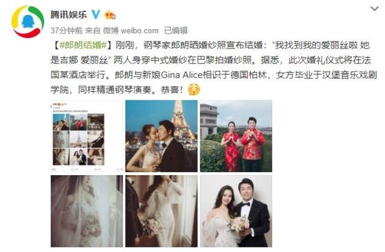 郎朗在自己的社交媒体晒出九张婚纱照并表白:“我找到我的爱丽丝啦 她是吉娜 爱丽丝”。一直以来,郎朗的感情世界都被大家所关注,但甚少有恋情传出,如今他终于在36岁时完成了人生中的婚姻大事。