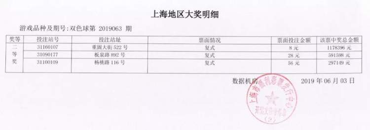 上海彩民也是好运连连啦~总共中得7注二等奖,单注奖金为294599元,彩票分别售出于重固大街522号、板泉路892号、杨桃路116号福彩销售点。其中,重固大街522号的彩票为8元复式投注,共中得4注二等奖。