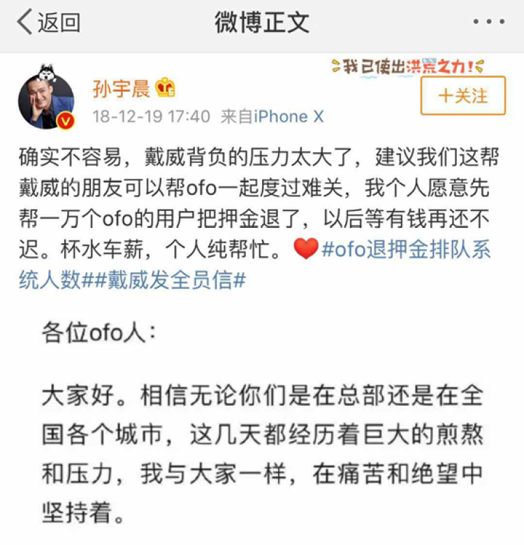 而除了区块链领域,社会话题孙宇晨也频频刷脸,2018年底,OFO退费难一事成为舆论关注的热点,孙宇晨出面代替戴威退掉了一万名用户的押金。据计算,一万名用户的押金价值近200万。事后也有不少用户在他的微博下表示了感谢。