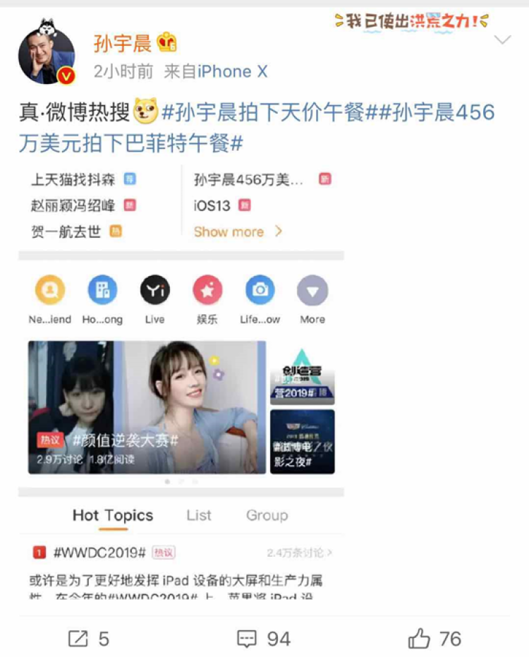 公开资料显示,历年来获得巴菲特午餐资格的人大多都比较低调,甚至有超过4分之1的人都是选择了匿名的形式并未向外界告知。不过孙宇晨在今天连发4条微博、点赞2条、以及在朋友圈晒热搜来向大众分享这一消息。