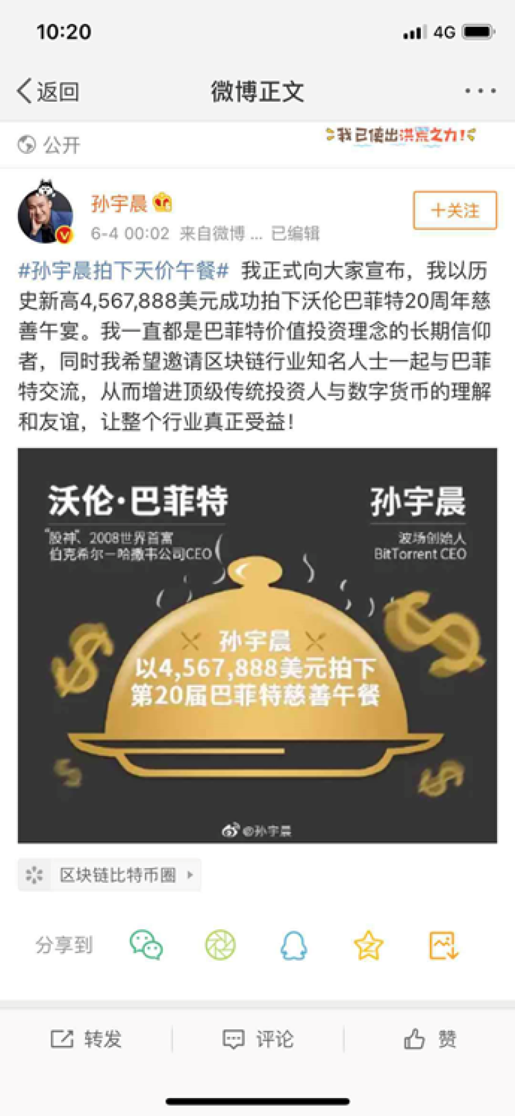 而在几小时前,孙宇晨亦通过社交平台公布了这一消息,声称自己是巴菲特价值投资理念的长期信仰者,并表示希望邀请区块链行业知名人士一起和巴菲特交流,以增进顶级传统投资人与数字货币的理解和友谊。