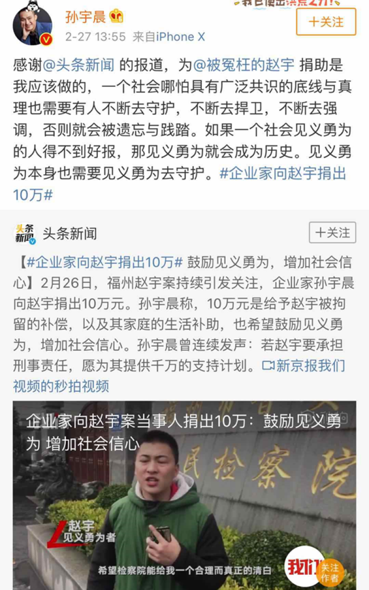 2月18日,孙宇晨再度发声,为赵宇案提供1000万支持计划,用于伸张正义。被不少网民评价为正义之士。