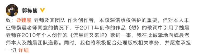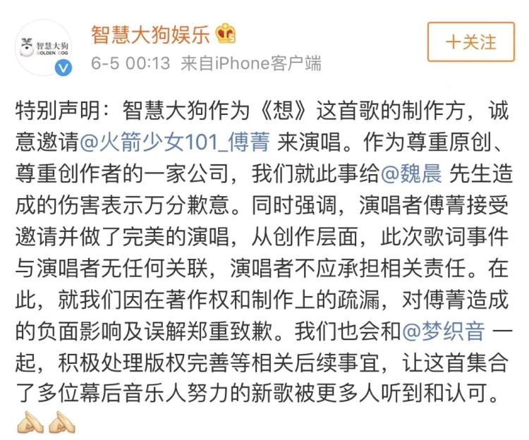 紧接着,这首歌的制作方智慧大狗也发表声明,向魏晨道歉,将演唱者傅菁从中撇清,并表示已与魏晨沟通过此事……