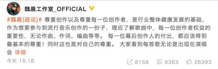 魏晨工作室获悉后表示,尊重创作及尊重每一位创作者是行业整体健康发展的基础。对于侵权行为,魏晨方将不排除采取法律手段维护艺人合法权益。
