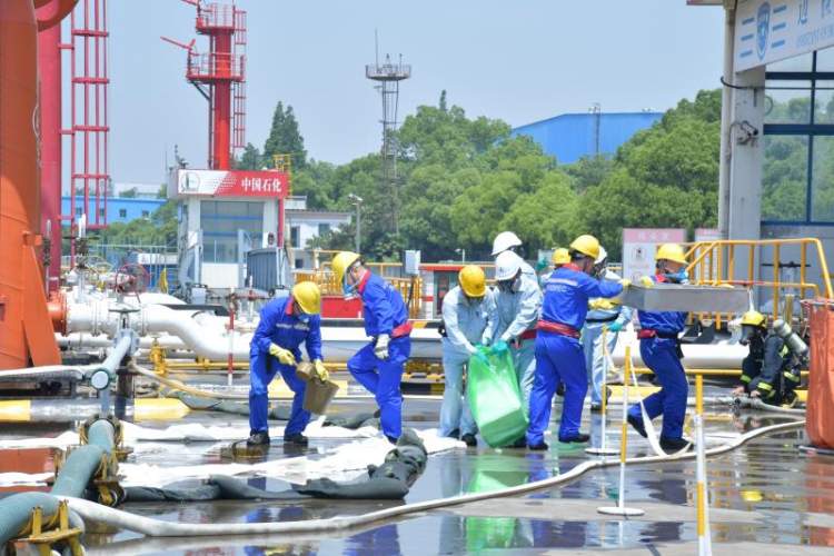 接到报告的油库主任立即启动油库码头油品泄漏、防水体污染应急预案。随着警报声响起,各方紧急出动。由18名战斗员组成的驻库消防队,乘坐泡沫消防车和应急物资车赶往现场,由油库员工和联防单位组成的安保警戒组、应急抢险组、后勤保障组也从油库各个方向赶往现场。