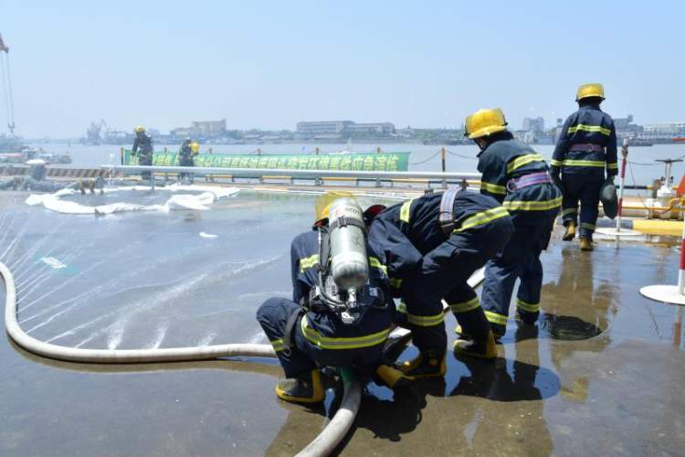 消防队员进入码头区域,用沙袋对泄漏区域进行外围封堵,防止油品大量流入黄浦江,同时在现场铺设水幕水带稀释油气浓度。