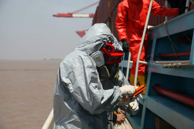 洋山港海事局接到报警后立即进行信息核实,确定事故等级后按相应程序将险情上报并启动应急预案,指派执法人员登轮协调码头和危险化学品处置专业力量展开应急处置。处置过程紧张有序,泄漏集装箱被吊离事故船舶并运至隔离区进行后续处理,泄漏到船舱内的污染物也得到专业清理。