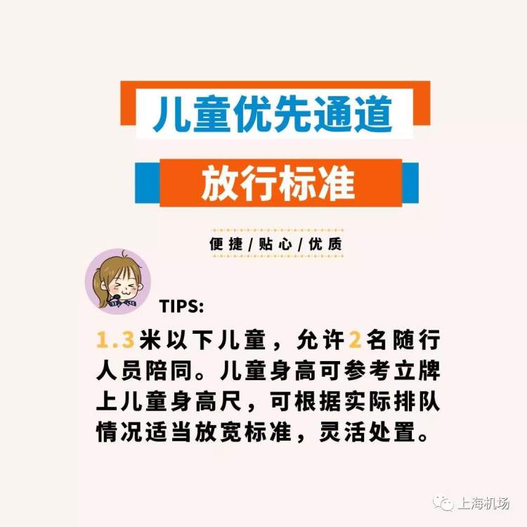 宝爸宝妈看过来!浦东机场试运行儿童优先安检通道 胡迎 2019-6-05 来源:周到上海 今后,带小朋友出行将更便捷!浦东机场试运行儿童优先安检通道。如果宝爸宝妈带着身高1.3米以下的儿童,一起到浦东机场乘坐出发航班,可以体验正在试运行的儿童优先安检通道! 按照相关规定,1名1.3米以下的儿童可以有两名随行人员陪同,儿童身高可以参考立牌上的儿童身高尺。安检员会根据当日实际排队情况适当放宽标准、灵活处置。 目前,浦东机场1号、2号航站楼的4个安检区域均设有儿童优先安检通道,旅客可以根据指示牌的提示和安检员的引导过检。 来源:周到上海 作者:胡迎 赞一个 (0)