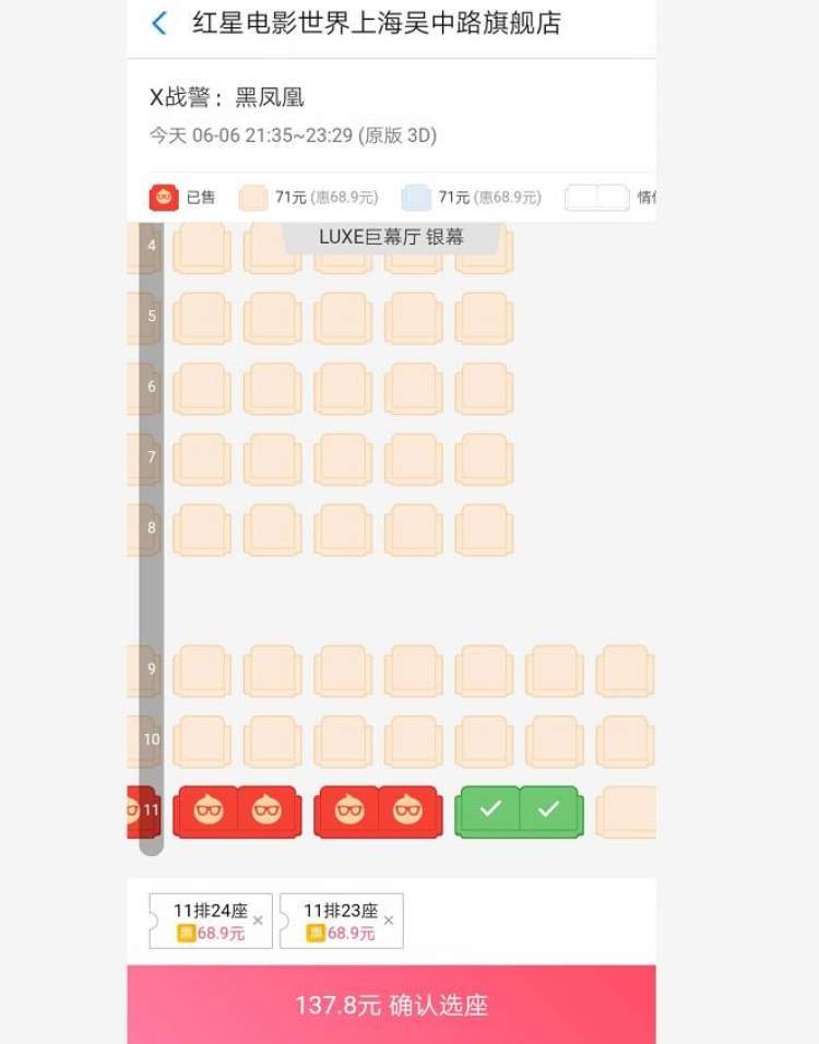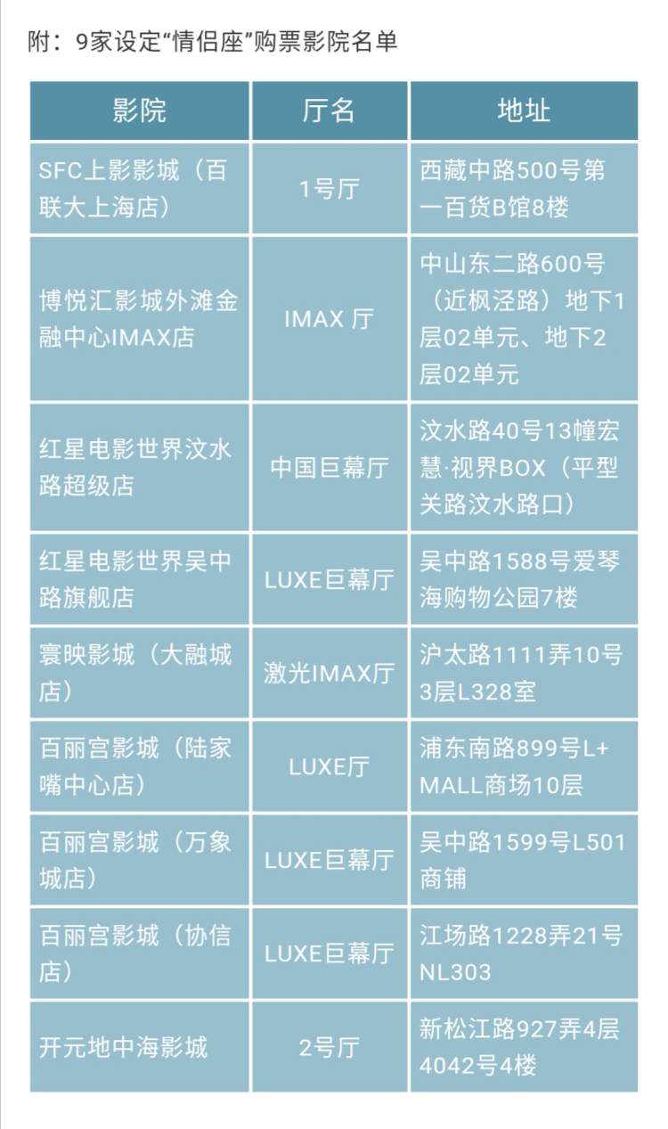 今年9家影院有“情侣座”的购买设置,一键下单,两个座位,只想买单张票的影迷须注意。