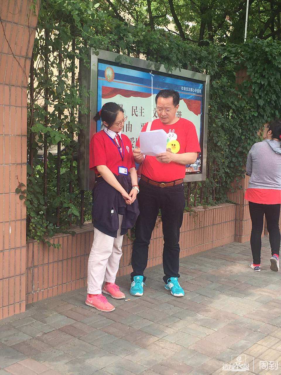 两位文来中学的家长正在考场外窃窃私语。他们两个孩子昨晚十点多就睡了,今天五点多起来的,再睡就睡不着了。