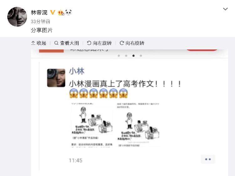 看到自己的漫画登上高考卷,小林自己也难掩激动心情,在朋友圈发文。