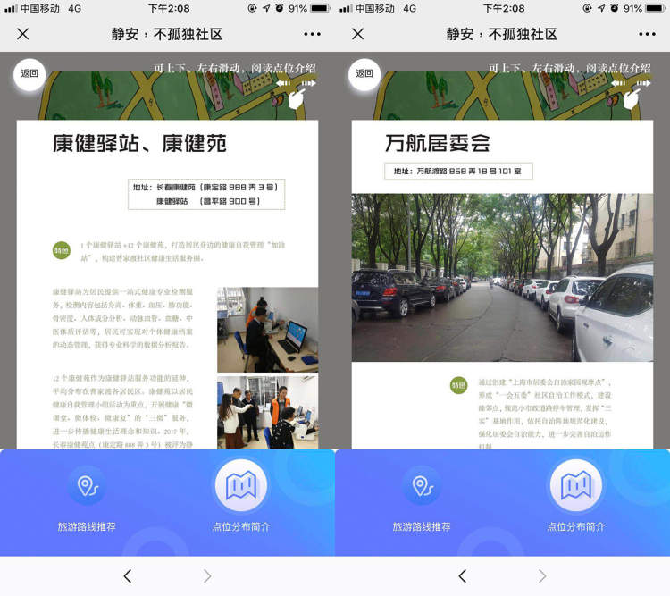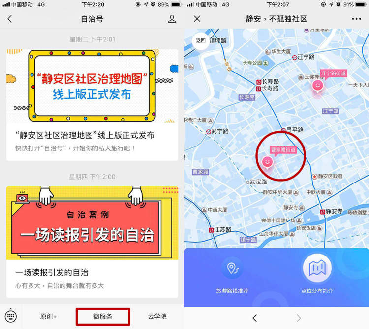 近日,“自治号”微信公众号发布了“静安区社区治理地图”线上版。社区居民可选择查看本街(镇)或其他区域的治理项目。曹家渡共有6个社区治理项目入围,分别是“社会组织孵化中心”“康健驿站、康健苑”“宝贝计划屋”“万航居委会”“桂花园小区”“社区生活服务中心”。