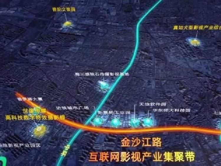 金沙江路地面连接上海市的内环线、中环线、外环线,地下有地铁13号线,距离虹桥交通枢纽15分钟车程。金沙江路沿线有大量楼宇和园区可供企业入驻,阿里影业、淘票票、联瑞影业、世像传媒、苏宁环球传媒、承兴影业、金影科技、台北影业等影视企业均落户普陀,人才储备充足。