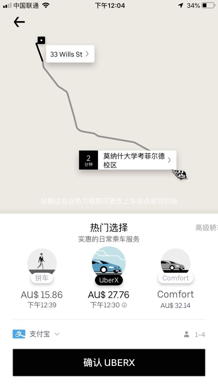 Uber打车的价格为27.76澳元,大约为134元人民币。