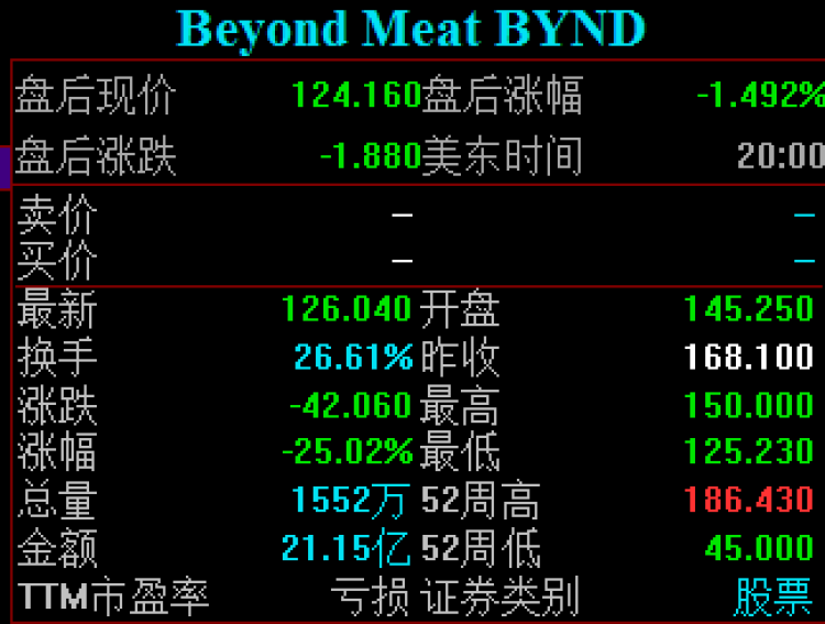 个股方面,隔夜人造肉第一股BeyondMeat以大幅跳低近14%开盘,至收盘报126.04美元,跌幅25.02%。
