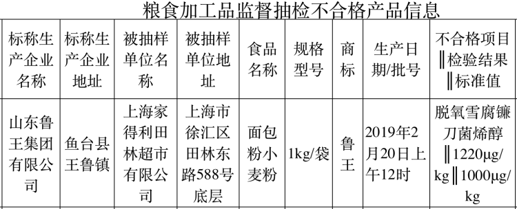 今天,上海市市场监督管理局公布了最新本市食品安全抽查结果,在561批次样品中,有两批次食品不合格,分别为家得利田林超市销售的1批次鲁王牌面包粉小麦粉脱氧雪腐镰刀菌烯醇不合格,以及联华超市销售的1批次鸡精调味料谷氨酸钠不达标。