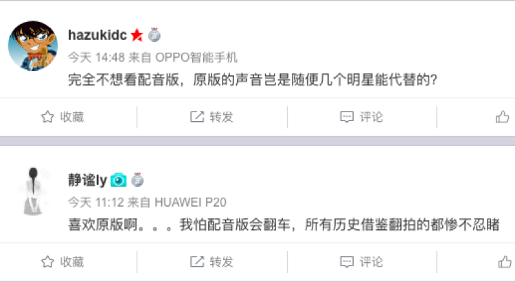 有的原版死忠粉表示完全不想看配音版,最大的原因还是担心配音版会“翻车”毁角色,或者是担心会“跳戏”。