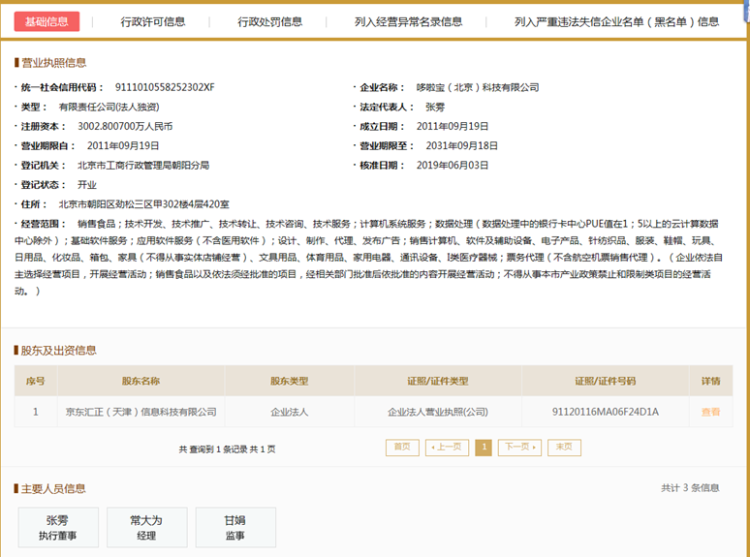 目前,哆啦宝法定代表人变更为张雱,公开资料显示,张雱曾任职京东金融,现为刘强东助理。同时还担任哆啦宝的执行董事。根据企查查,张雱名下共有437家关联公司。