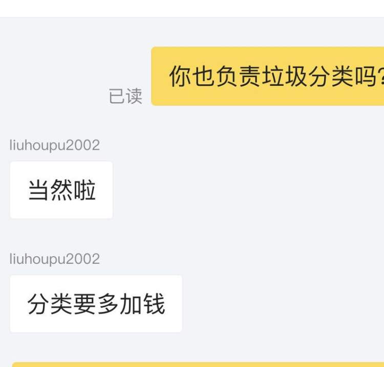 同时,这名垃圾代收人员表示,如果客户需要提供垃圾分类服务,那价格就要再协商。当被问及选择该项服务的客户有多少时,该代收人员则表示,“生意一般。”