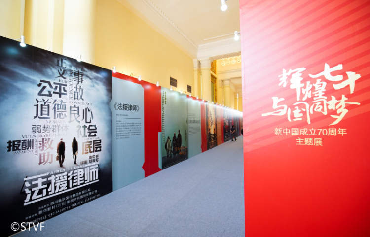 走进上海展览中心大厅,两边的回廊是喜庆的红色,一幅幅三米高的巨幅电视剧海报沿着回廊通向远方,讲述着新中国70周年电视剧点点滴滴的变化。展示的作品中有献礼新中国成立70周年的电视剧《建国大业》;纪念新中国成立70周年、古田会议召开90周年的《绝境铸剑》在福建省上杭县古田会址正式开机;有献礼澳门回归祖国怀抱的《弯弯的大湾》;