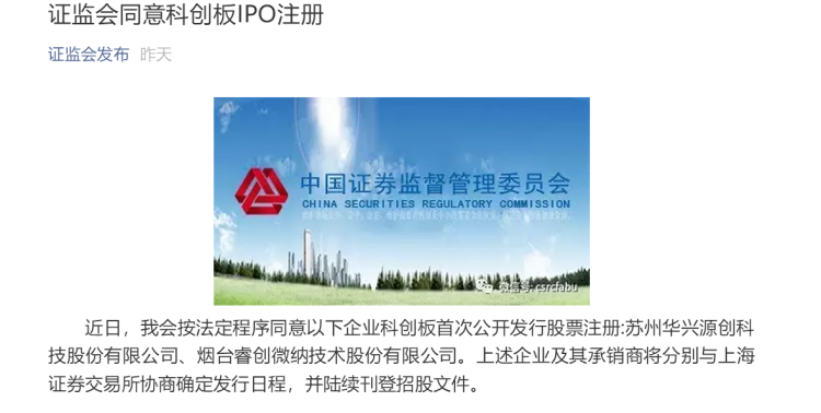 6月14日晚间,证监会发布,近日证监会按法定程序同意华兴源创、睿创微纳科创板首次公开发行股票注册。上述企业及其承销商将分别与上海证券交易所协商确定发行日程,并陆续刊登招股文件。在目前提交注册的6家企业中,这两家拔得头筹。