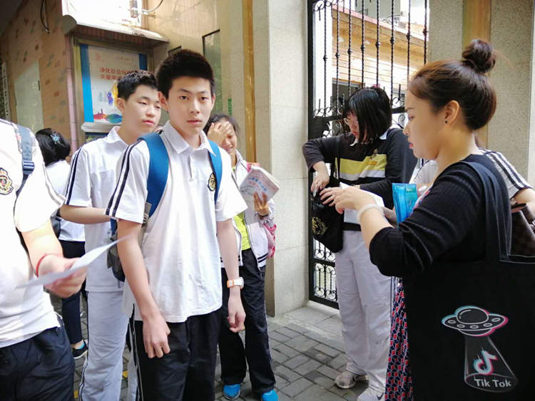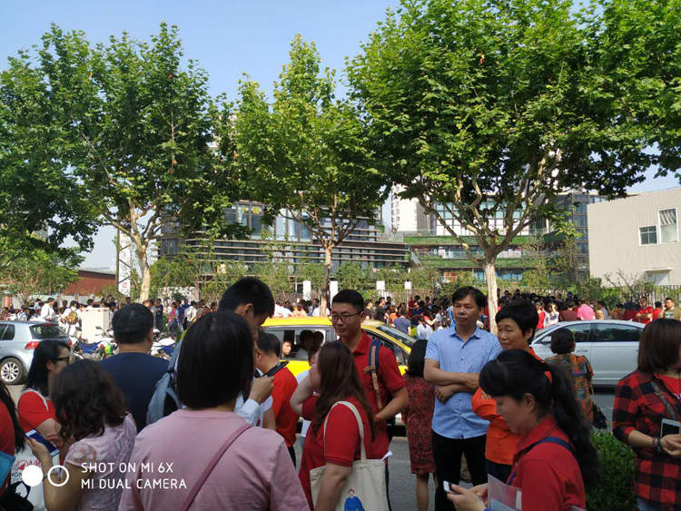 父母们都穿着一身红的T恤衫为孩子加油,父母在考场外给予拥抱,鼓励安慰自己的孩子,以放松孩子紧张的情绪。