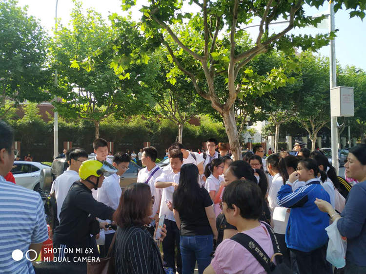 周到君兵分几路蹲点在考场外,9点将是第一门语文科目的开考时间,8点不到考场外已经站着一批考生了,维护秩序的警察也早早的来到了岗位上,有同学带上了幸运手链,校长亲自送考,家长们给孩子一个拥抱表示鼓励,考场外家长、老师给考生的叮嘱与祝福声此起彼伏。