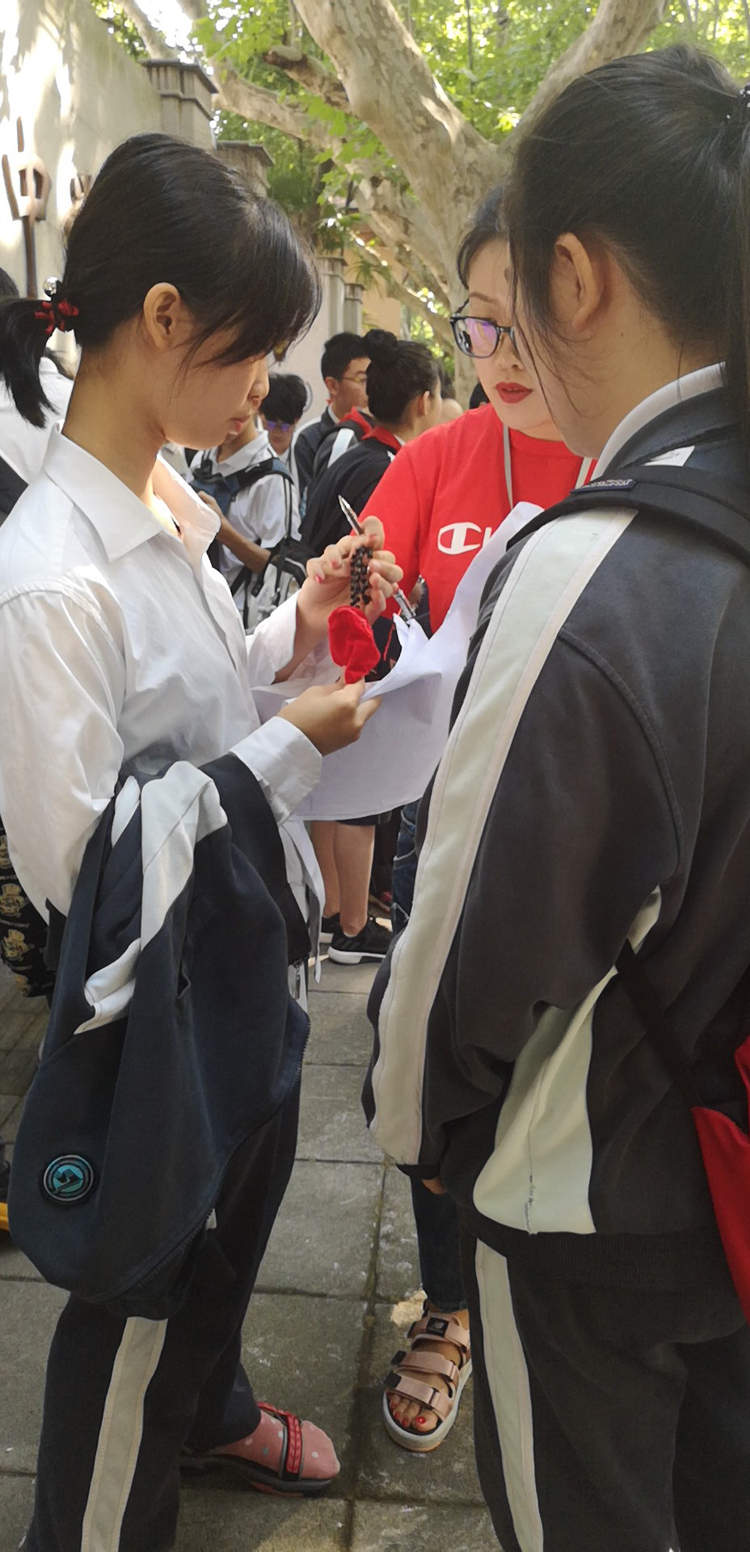 有考生带了红布包的手链吉祥物,老师说:这是拼人品的时候,一定得说好话,考啥啥会,龙腾虎跃!