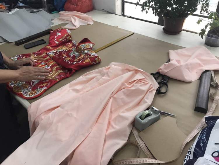 陈师傅面前摆着的是一件大红绣金的喜服,上衣已经基本完工,但放在一旁的袄裙却是橘粉色的,李嘉陵说,这是在做胚样,先用普通一些的布料做件样衣、样裙,试穿后合适再正式开工,而此前也算“精雕细琢”的胚样则会被丢弃,“传统服饰的关键部位工艺还得经验丰富的老师傅把关,顾客们看中的就是我们的服务。”