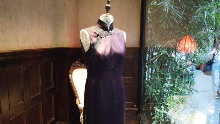 而一旁的一件深紫色旗袍乍一看平平无奇,但李嘉陵说,这件重磅真丝旗袍没有任何绣花、镶嵌却售价破万,原因就在于开衩部位花样所采用的工艺——普通旗袍都会用铜丝滚边塑造立体感,但这件旗袍包括盘扣都没有用到其他辅助材料,而是仅仅只用面料的“缝头”卷进去,“摸上去会有一点硬硬的感觉,但很明显不是铜丝,对手工的细致程度有极高的要求,这种工艺全上海应该只有我们在用了。当然了,基本上只有内行人才看得出门道。”