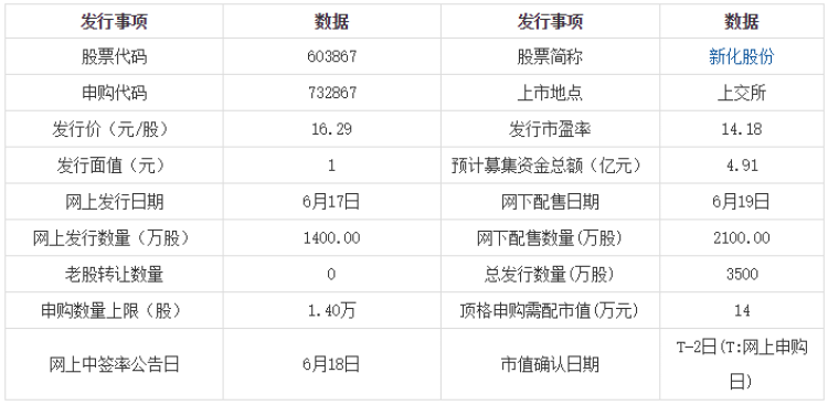新化股份此次发行,单一帐户申购上限14000股,申购数量为1000股的整数倍,需配置上交所市值。