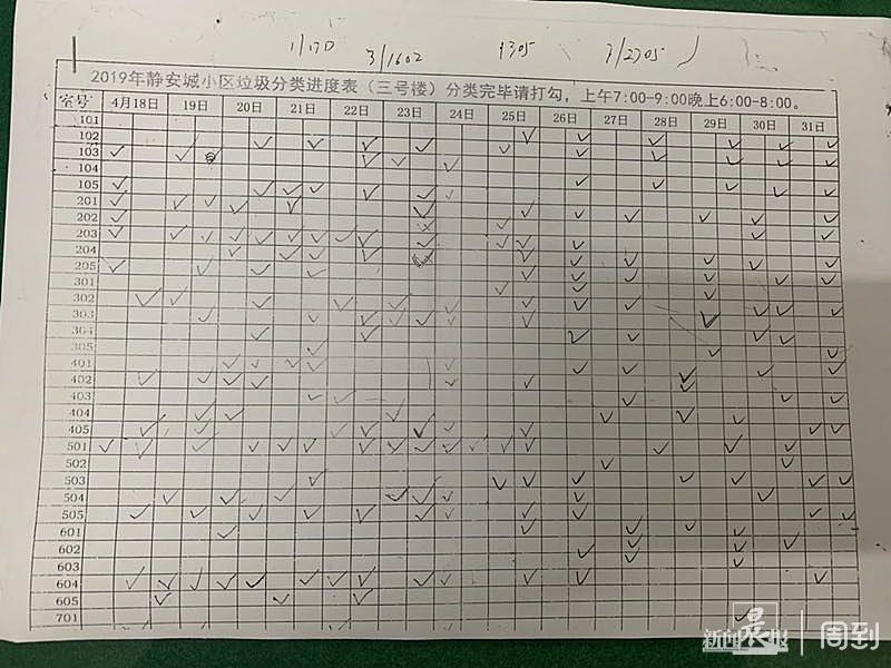 韦慧告诉记者,静安城现在有2000多居民,参与垃圾分类的居民已经有85%。而统计出这份数据也花费了居委会和志愿者不少心血。“居委会事先把每幢楼的居民室号制成空的表格交给志愿者,每每有居民前来扔垃圾,志愿者便会询问来投放垃圾的居民住几号几室,在相对应的空格内打勾。”韦慧说道。