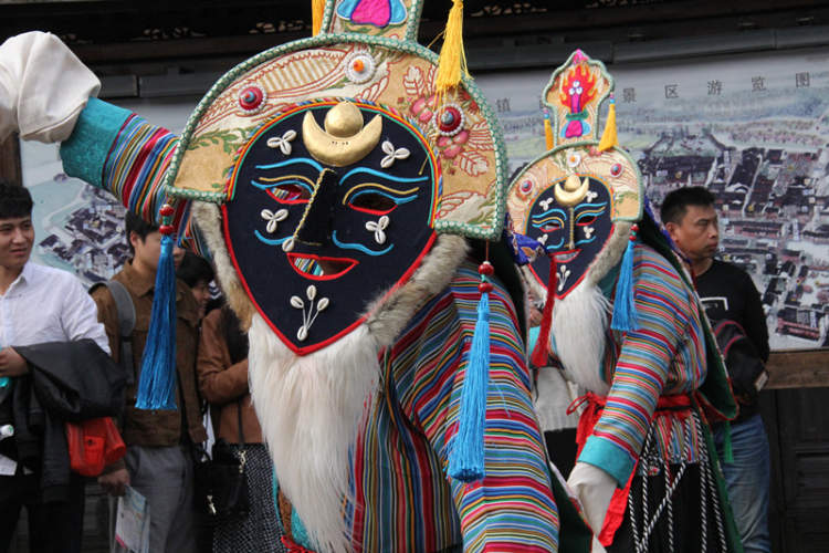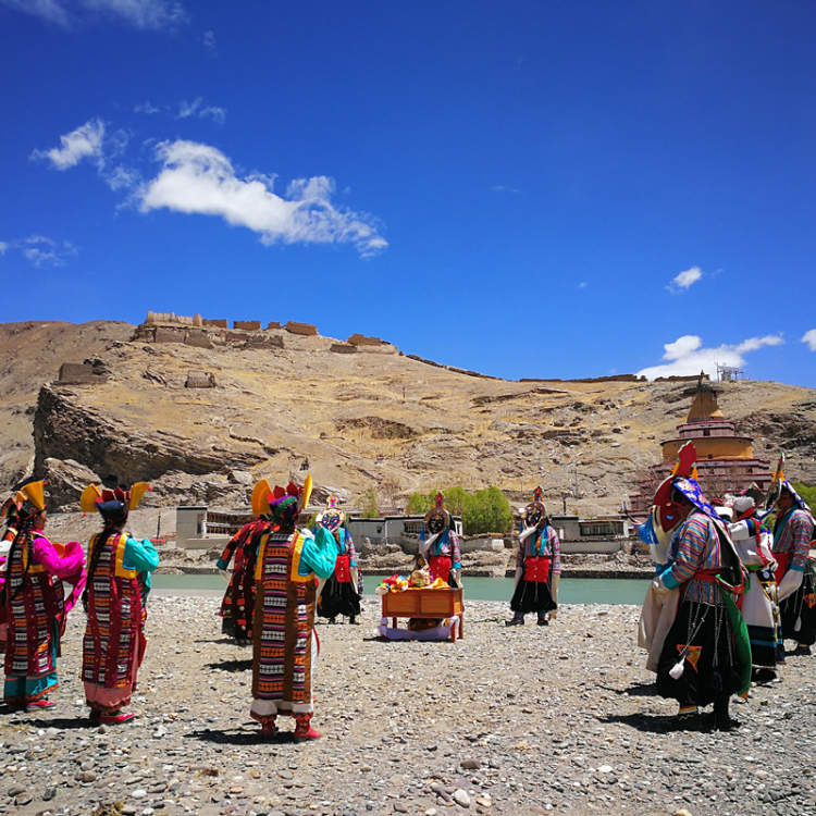 日吾其乡,迥巴藏戏的发源地,地处雅鲁藏布江上游大峡谷,海拔4310米。相传在600多年前,噶举派高僧唐东杰布立志在此修建铁索桥,造福雅鲁藏布江两岸人民。为募捐资财,他邀请能歌善舞的七姐妹组成蓝面具藏戏班,随处表演,化得专款。在此期间,他们吸收融汇当地群众弹、唱、舞的极高技艺和传统艺术营养,形成了自己独有的风格特色,使迥巴藏戏的表演、唱腔艺术,在藏族群众中享有崇高的名望。