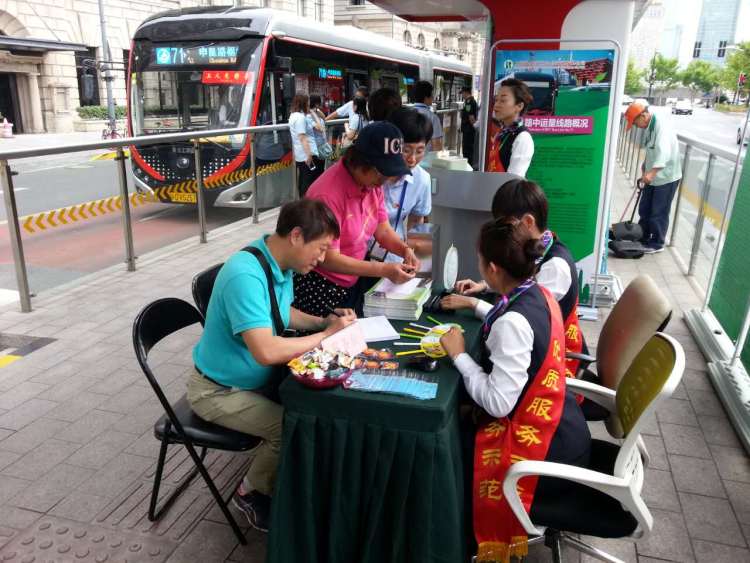 记者还发现,现场还设摊征集意见,乘客们正在填写“服务评议表”。表格上有“乘务员满意度”、“安全行车满意度”、“车厢清洁满意度”、“发车班次间距满意度”等项目的意见征求。“我每天都要乘坐71路到外滩来,感觉71路现在越来越快捷,驾驶员开车已经很熟练了。建议车厢的空间再扩大些,这样会更加舒服。”一位中年男乘客表示。