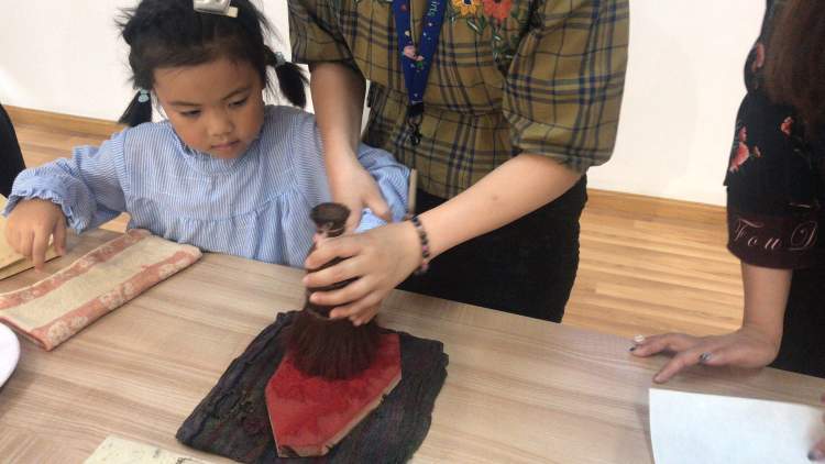 在老师的指导下,前来体验的市民们也纷纷的上前操作起来,先用毛笔将颜料均匀的涂抹在木刻模板上,再用棕刷轻轻地将其渗透,盖上宣纸后通过双手的按印,将图案拓在纸上。