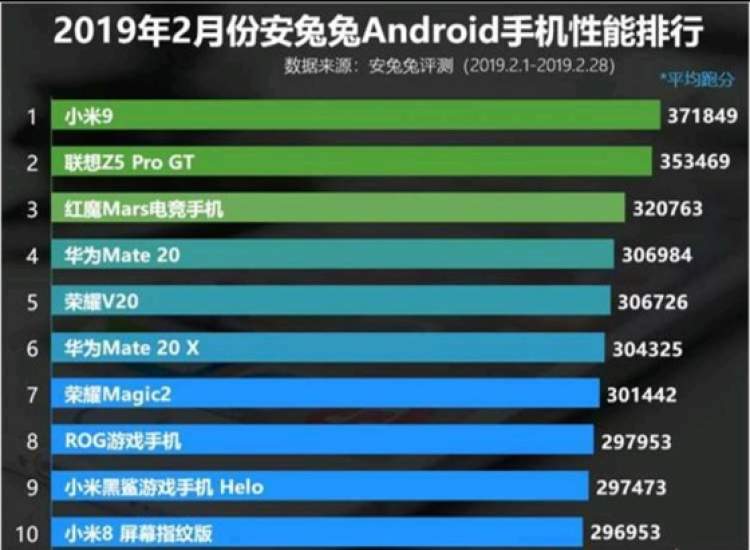 在此前2月的安兔兔榜单性能榜上,小米9手机刚一发售就以37万分登顶榜首。当时第二名是联想Z5 Pro GT手机,跑分比小米9低2万。