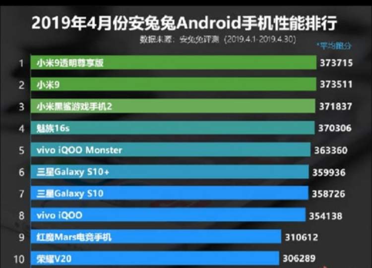直至4月份的手机性能榜单上,小米9依旧保持统治力。