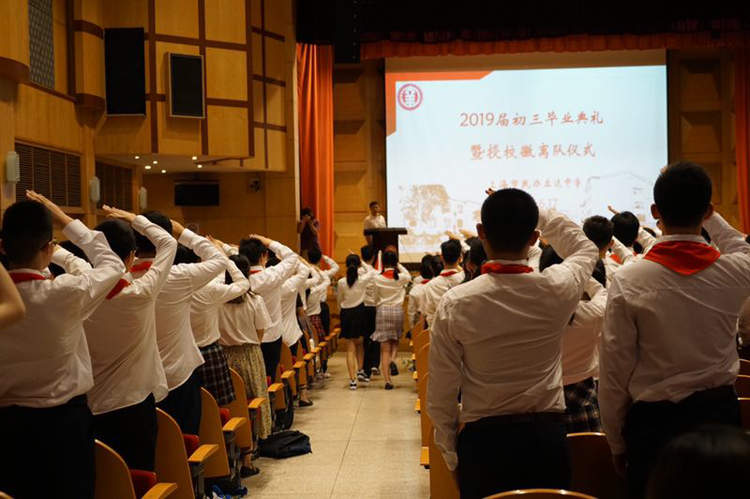 深情感人的诗朗诵后是全体学生毕业宣誓。初三8个班级依次表达了自己获赠毕业校徽的激动心情和对母校的无限感恩留恋。“四年磨砺,立志凌绝顶;喜获校徽,努力报师恩”“逐梦紫英,明德惟馨;圆梦彼岸,桃李芬芳”“难忘立达,满园桃李”……一句句誓言发自肺腑,催人奋进,感人至深。而全体学生齐呼“桃李满天下,校徽寄深情,向立达致敬,为未来壮行”的铿锵誓言又将毕业典礼和授校徽仪式推向了高潮。孩子们对母校的依恋与不舍、感恩和敬意都溢于言表。