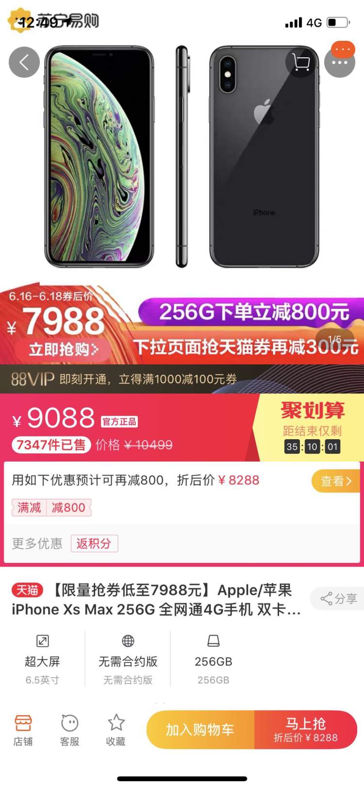 以 iPhone XS Max 256G 为例,天猫苏宁旗舰店显示价格为9088元,用上店铺优惠和天猫平台优惠后,实际到手价为7988元。