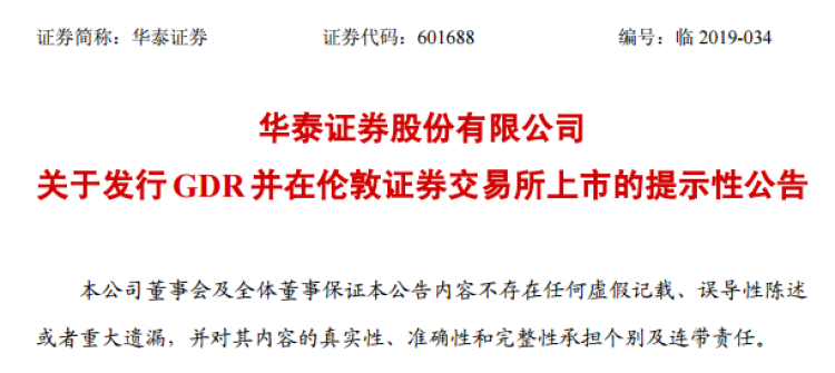 另外,华泰证券发行的沪伦通下首只全球存托凭证(GDR)产品同日在伦交所挂牌交易,首日上市交易上涨2.4%。截至今日收盘,华泰证券A股收报19.45元,上涨0.88%,华泰证券H股收报11.76港元,涨幅1.55%。